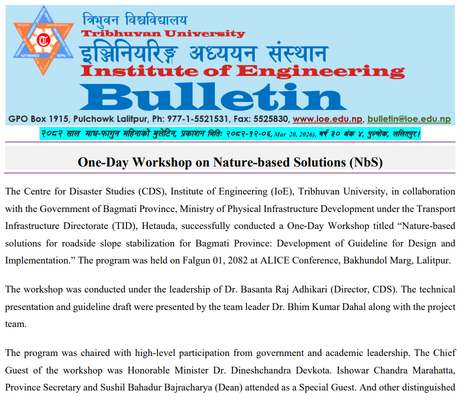 The Institute of Engineering(IOE), founded in 1930 (1987/11/19BS) as Nepal’s first technical school and reformed to present shape in 1972, is producing outstanding engineering technicians and engineers for more than 80 years. The tradition of excellence in the IOE is further intensifying in the course of time. IOE is also becoming more and more responsive to the ever-changing needs of the students and the engineering profession. The Institute is experiencing a period of significant growth. The voyage of IOE departing from producing middle- and high level technician is continuing to running Bachel... ... ...